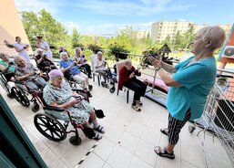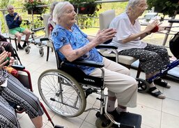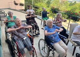 V létě, pokud je pěkné počasí, cvičí senioři z Domova sv. Jiří venku na terase. Dopolední protahovací cviky jim dodají více energie a zajistí dobrou náladu pro celý den.