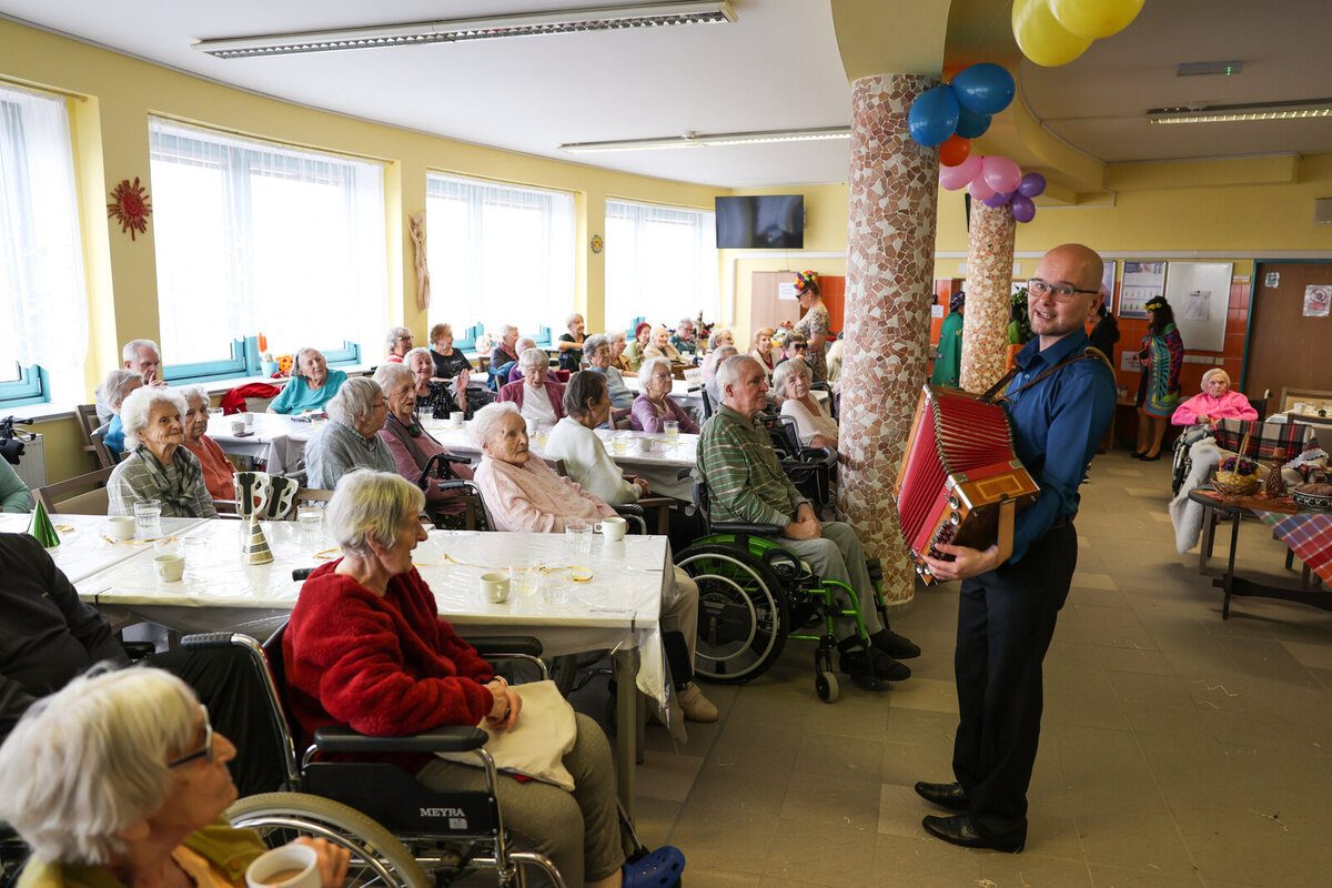 Masopustní veselí doprovodil na harmoniku také oblíbený akordeonista Jan Kubík, který zahrál známé písničky. Mnozí klienti si s chutí zazpívali, někteří se dokonce pustili do tance. Atmosféra byla srdečná jako na vesnických masopustních zábavách. Pro všechny klienty byla připravena také čerstvá káva a tradiční koblihy, které zajistilo vedení Městského obvodu Plzeň 4. Děkujeme!