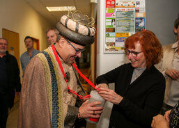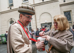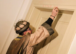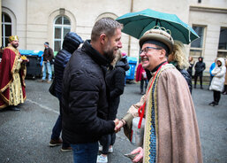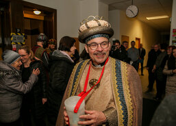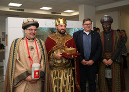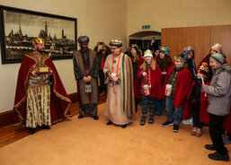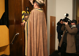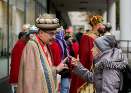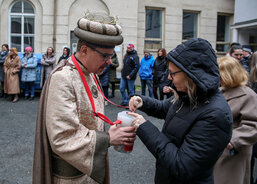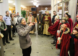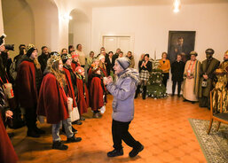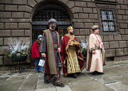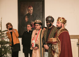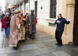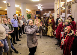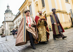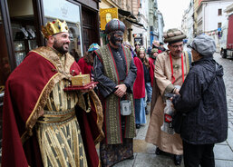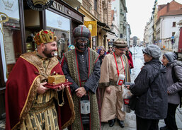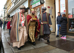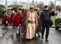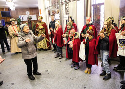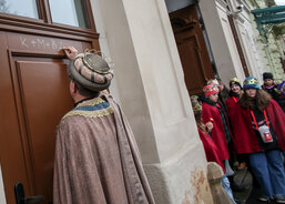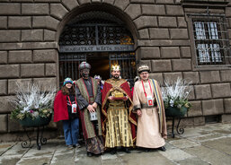 Zástupci kraje, města a biskupství také popřáli při koledě lidem vše nejlepší do nového roku a symbolicky popsali svěcenou křídou dveře písmeny K+M+B.
